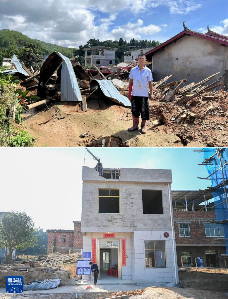 拼版照片:上图为6月20日拍摄的福建省龙岩市武平县中赤镇村民童祥恭站在被洪水冲毁的自家房屋前;下图为12月17日,童祥恭在打扫新居。今年6月,中赤镇遭遇特大暴雨,7个村近9000人受灾。