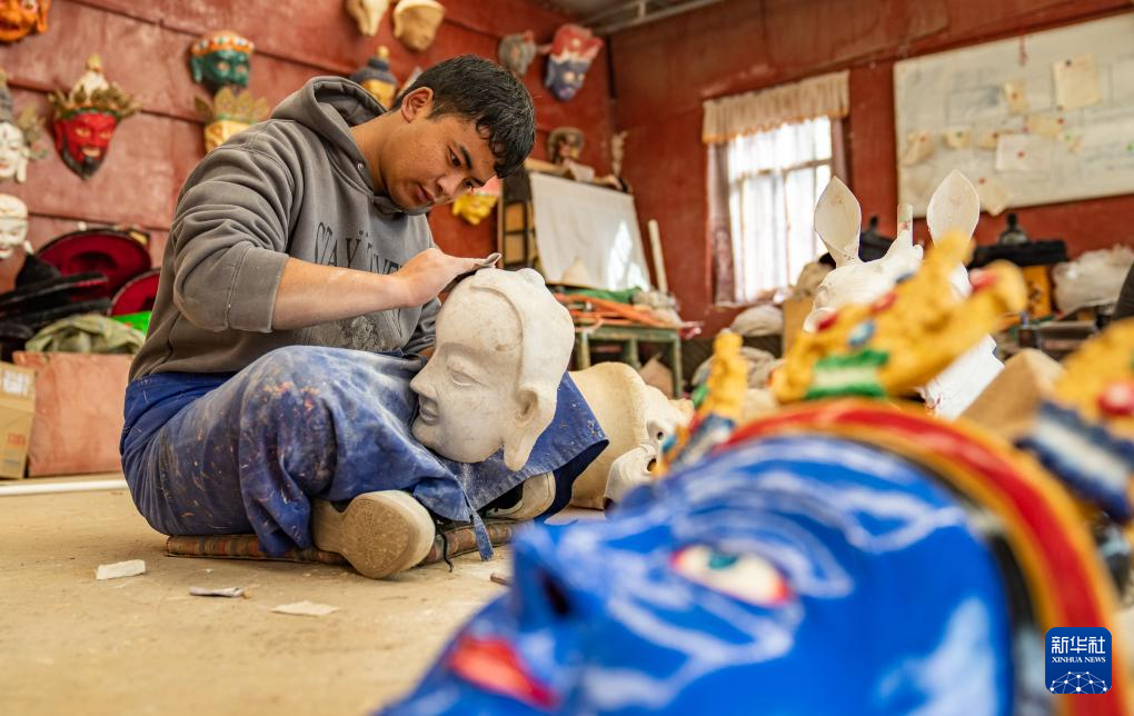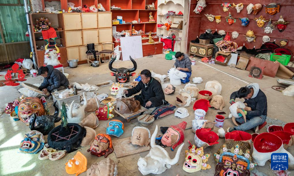 12月9日,拉萨布制面具制作技艺西藏自治区级非遗传承人西洛(中)和同事一起制作西藏传统面具。西洛是拉萨布制面具制作技艺的西藏自治区级非遗传承人,他制作的面具广泛运用于藏戏表演中。2012年,在政府的扶持下,西洛创办了拉萨市达孜区雪乡扎西岗传统手工艺合作社。近年来,合作社不断吸纳当地群众学习面具制作技艺,不仅为当地群众提供就业机会,同时也助力非物质文化遗产的保护和发展。