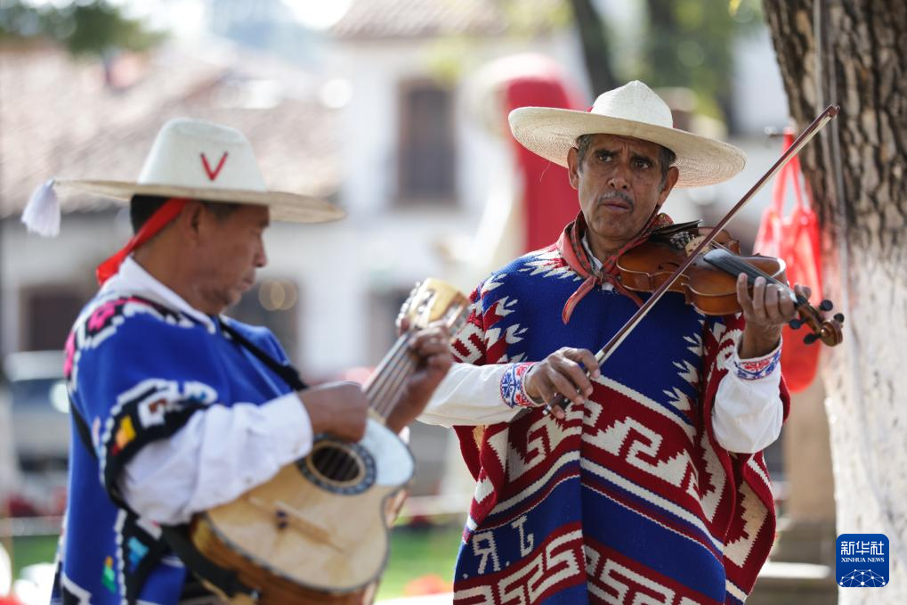 12月7日,在墨西哥米却肯州的帕茨夸罗,艺术家演奏小提琴和吉他为“老者之舞”表演伴奏。