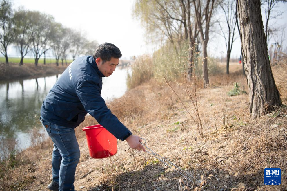 12月19日,巡河志愿者许凯在隋唐大运河通济渠泗县段捡拾垃圾。
