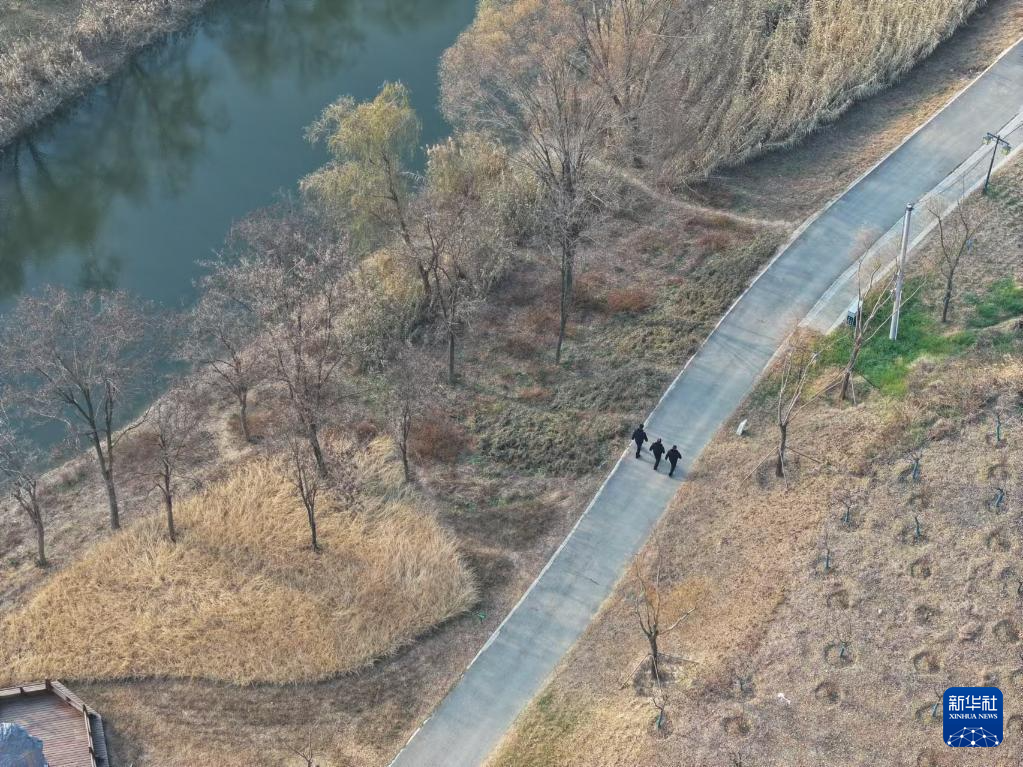 12月19日,巡河志愿者许凯(右二)和其他志愿者走在隋唐大运河通济渠泗县段旁的小路上,准备捡拾沿岸垃圾。