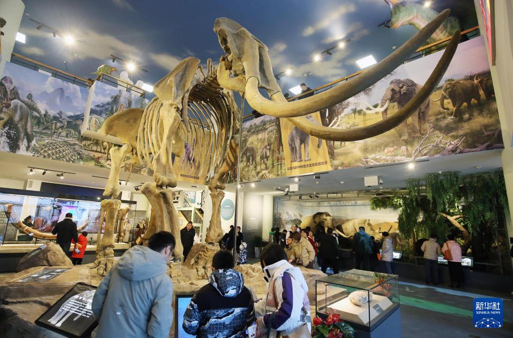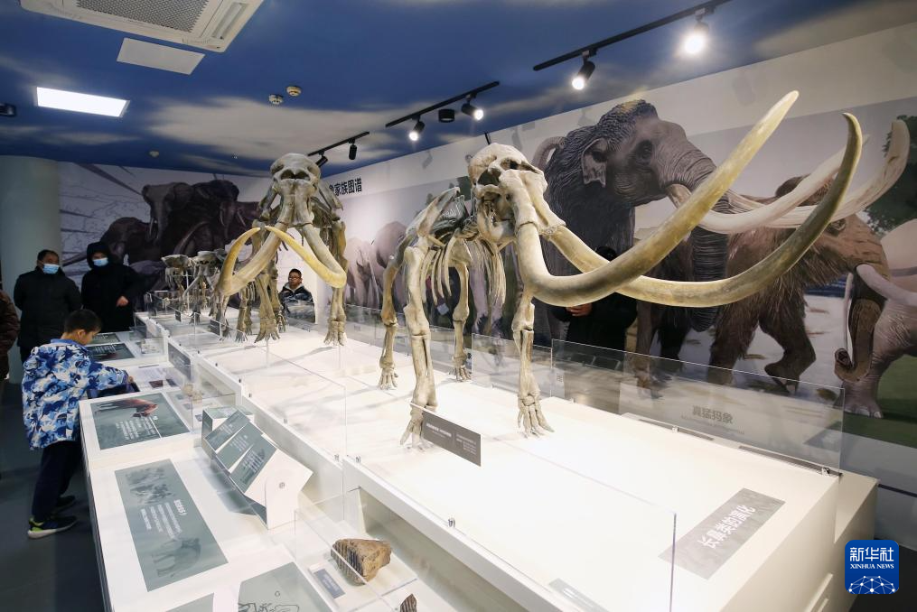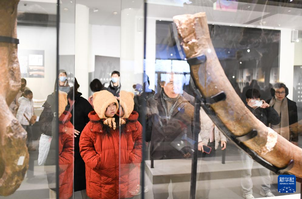 12月28日,人们在山东省潍坊市博物馆观看真猛犸象骨架3D打印模型。