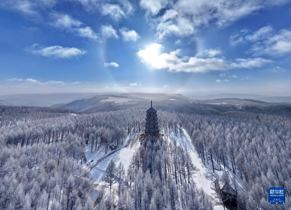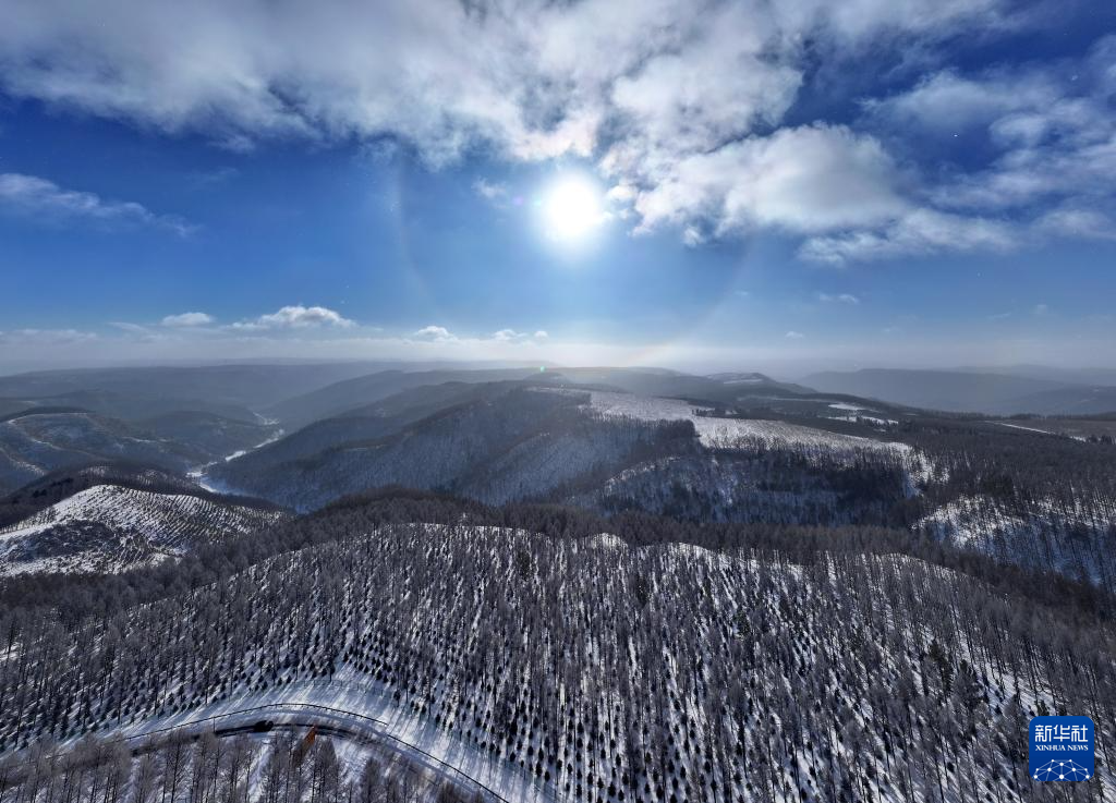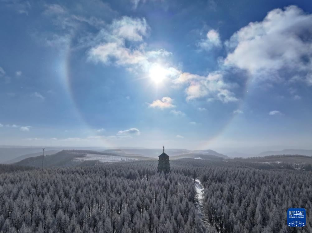 12月27日,塞罕坝机械林场出现日晕景观(无人机照片)。