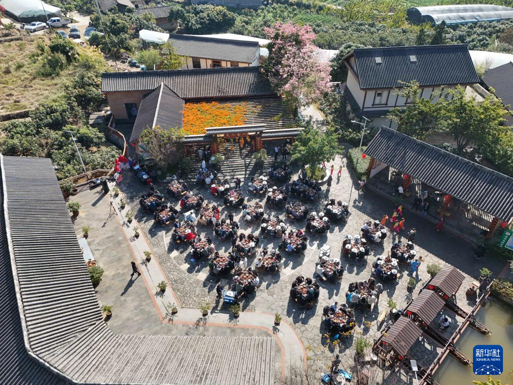 12月30日,村民和游客在坝坝宴上体验美食(无人机照片)。