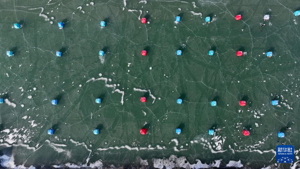 2025年1月1日,冰钓大赛参赛者在帐篷里参加比赛(无人机照片)。