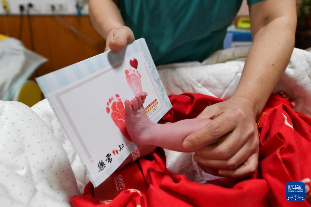 2025年1月1日凌晨,在位于吉林长春的吉林大学白求恩第一医院妇产中心产科,助产士梁平为新生儿印脚印。