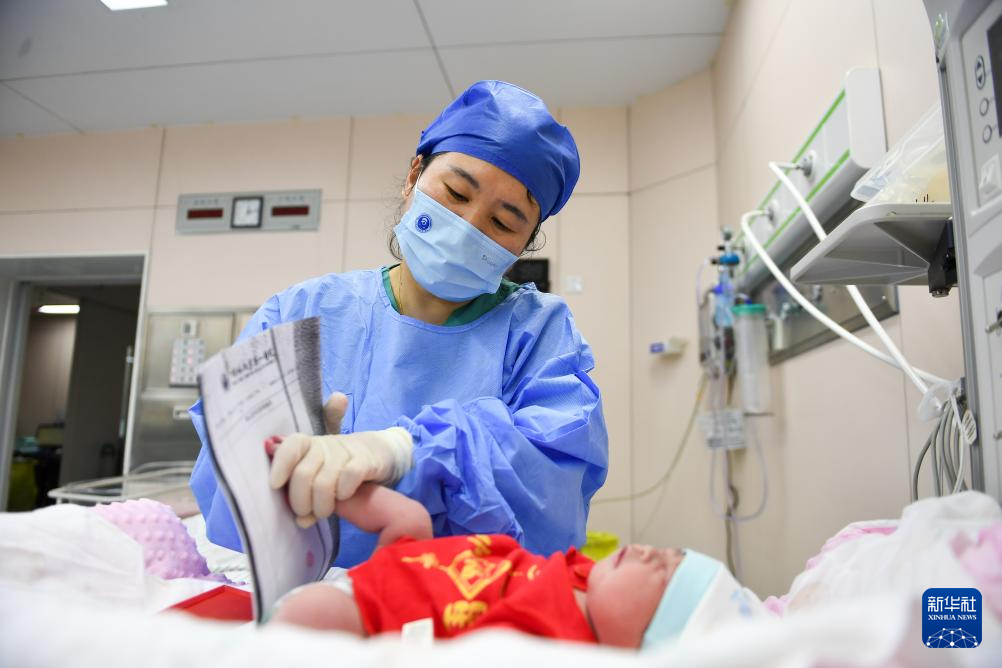 2025年1月1日凌晨,在位于吉林长春的吉林大学白求恩第一医院妇产中心产科,助产士梁平为新生儿检查身体。