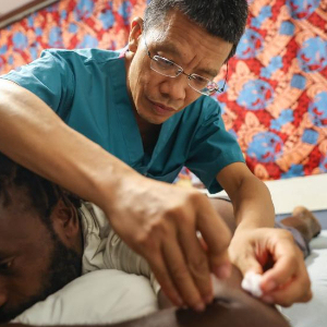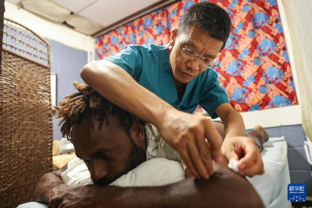 1月2日,在瓦努阿图维拉中心医院,中国援瓦努阿图医疗队针灸科医生谢衡辉为患者针灸治疗。