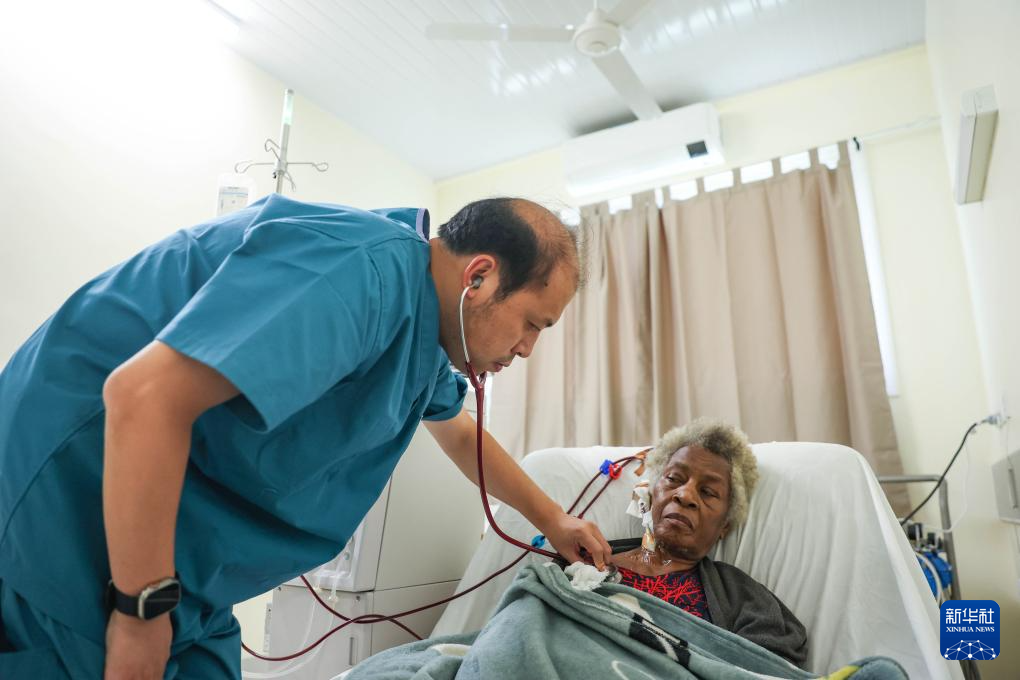 1月2日,在瓦努阿图维拉中心医院,中国援瓦努阿图医疗队副队长、呼吸与危重症医学科医生王睿为患者听诊。