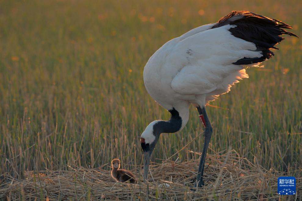 2024年5月7日,丹顶鹤在黑龙江扎龙国家级自然保护区看护雏鹤和鹤蛋。扎龙国家级自然保护区是世界上面积最大的野生丹顶鹤繁殖栖息地、最大的丹顶鹤人工繁育种群再野化基地。