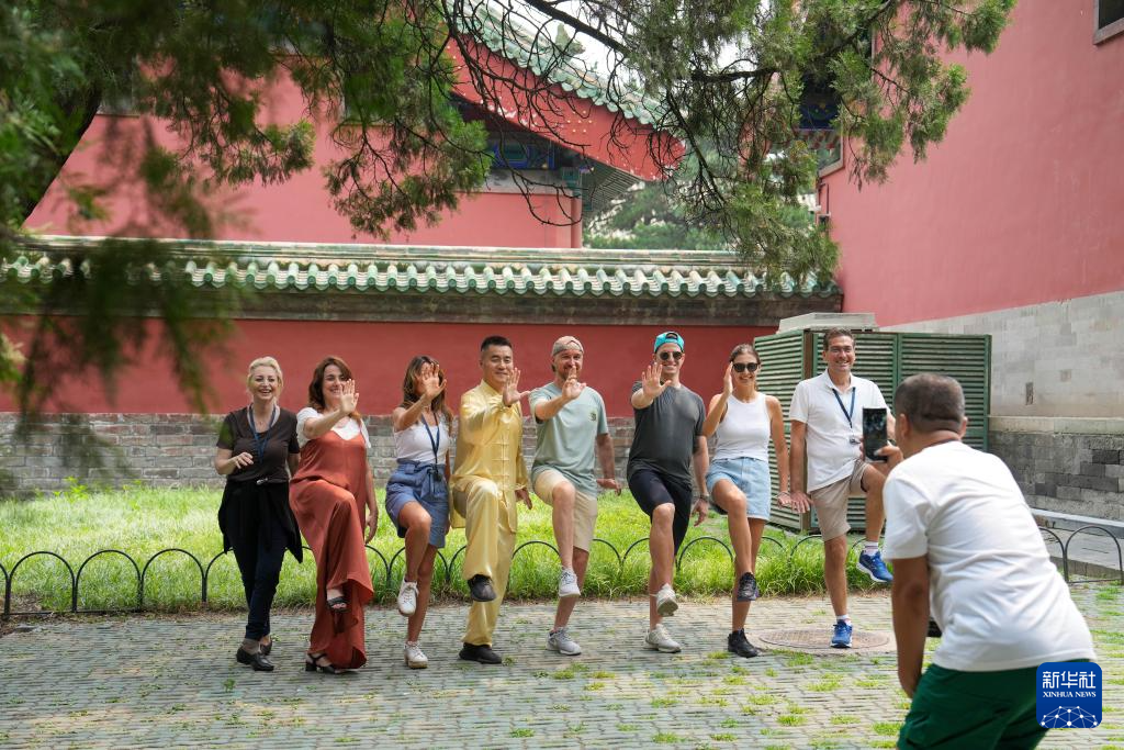 2024年7月9日,来自意大利的游客在北京天坛公园体验太极拳后合影留念。在“过境免签”等系列便利外籍人士来华的政策推动下,外籍人士中国行持续升温。
