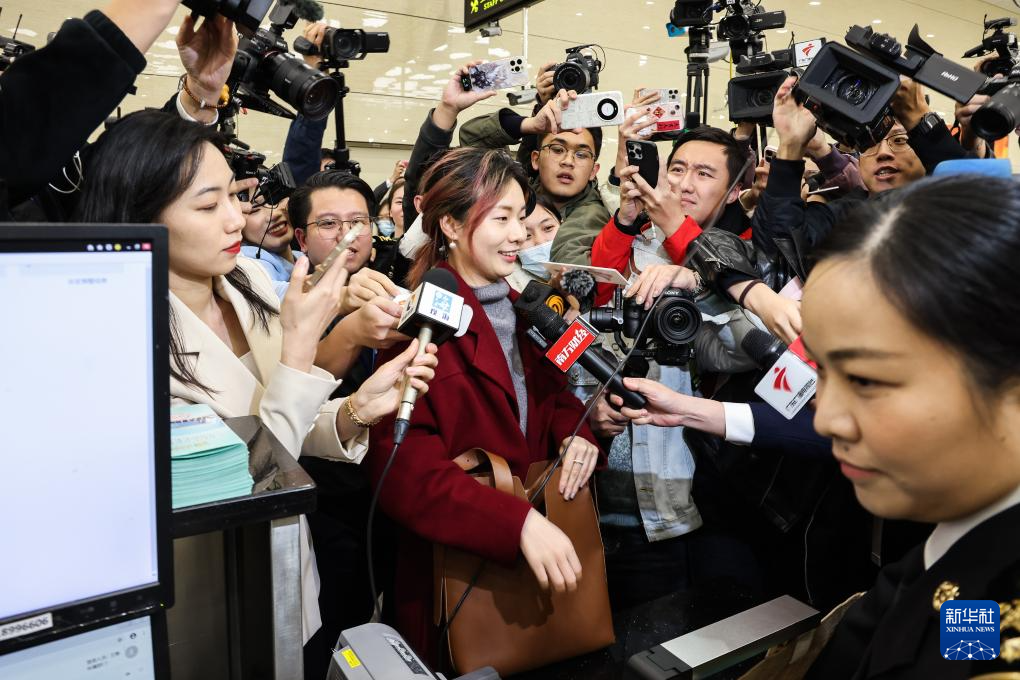 2024年3月1日,澳门市民程曦(红衣)在横琴口岸接受媒体采访。她是横琴粤澳深度合作区正式封关运行后首位通关的旅客。