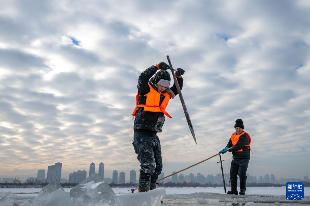 2024年12月9日,工人在松花江哈尔滨段采冰。这些采出的优质冰料被运往冰雪大世界园区等地,用于景观建设。