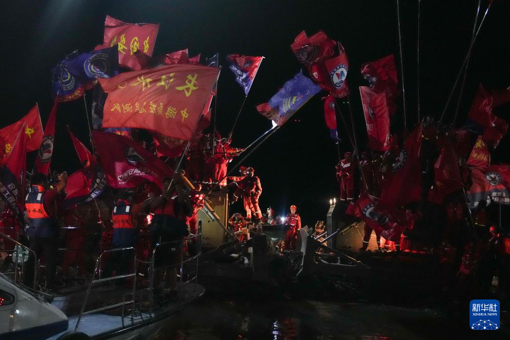 2024年5月1日,在中国南沙群岛仁爱礁海域,一艘舰载小艇在晚霞中结束训练归来。隶属于中国海警局第五局的华阳舰及其海警执法员们与其他海警舰艇一起执行该轮仁爱礁巡航值守任务,坚定戍卫祖国南沙海疆,维护祖国海洋权益。