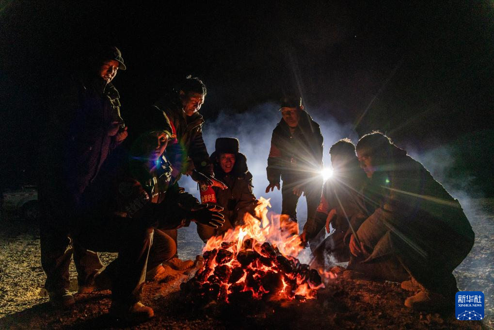 2024年5月10日,在位于西藏自治区北部的羌塘国家级自然保护区核心区域,野生动物专业管护队员在宿营地里烤火,燃料是野牦牛的粪便。