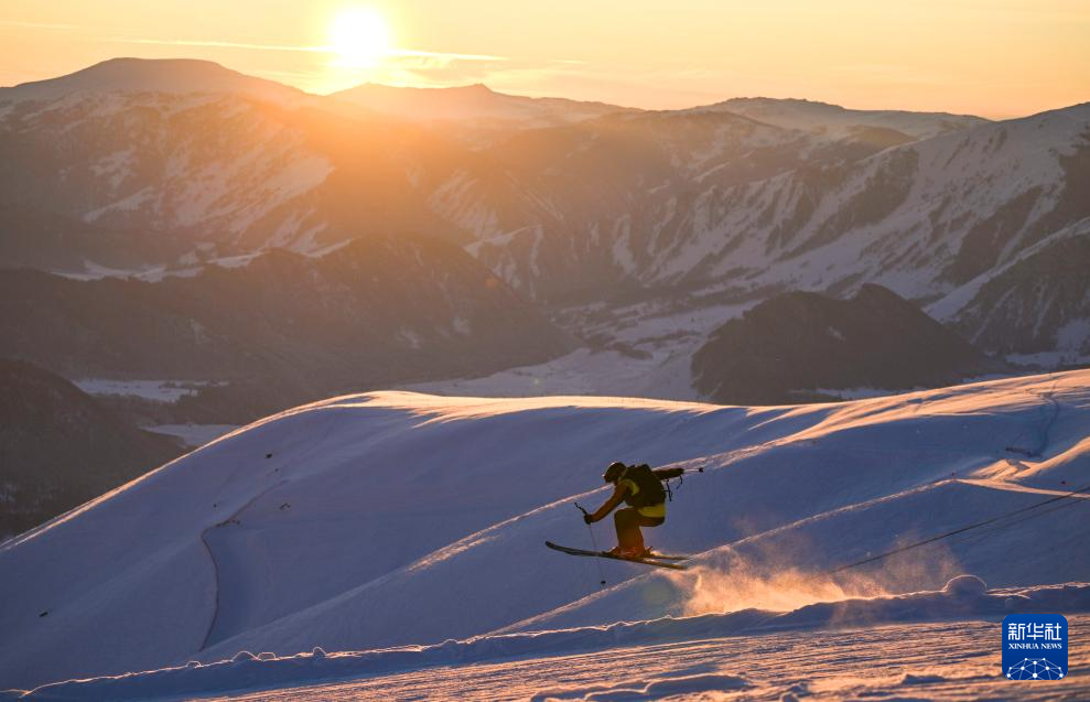 2024年12月3日,夕阳西下,26岁的滑雪巡救员满德力在新疆阿勒泰地区禾木吉克普林国际滑雪度假区巡逻。滑雪巡救员是人社部今年公布的“新职业”之一。