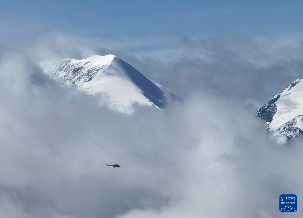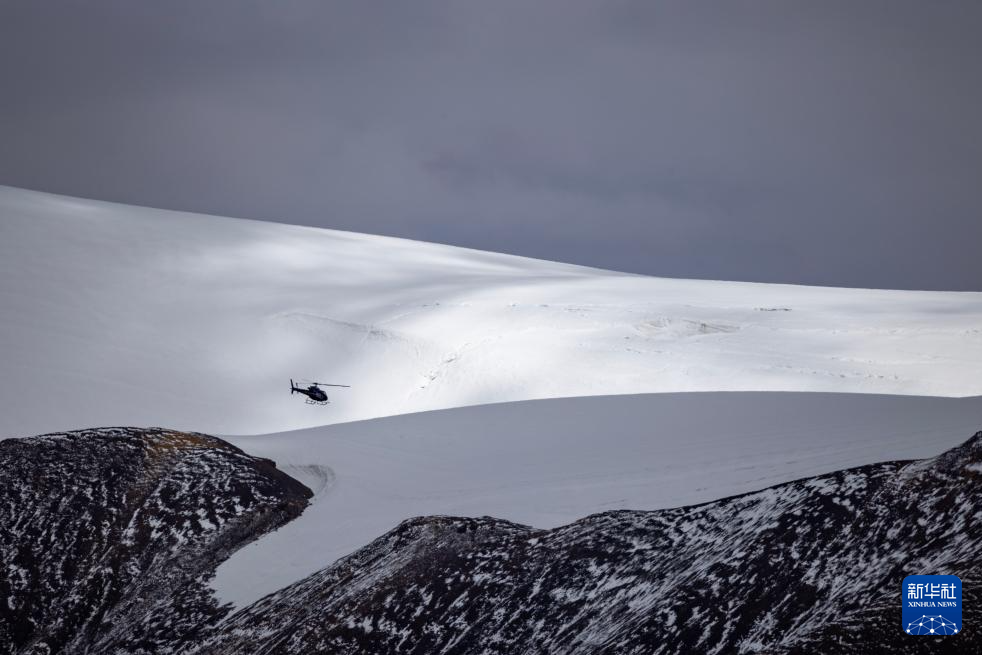 2024年9月9日,直升机将科考物资从海拔5400米的第二次青藏科考普若岗日冰原大本营运往海拔6100米的“Dome.C”点,为科考团队冰芯取钻工作做准备。普若岗日冰原位于羌塘国家级自然保护区的核心区域,在西藏双湖县东北约90公里。
