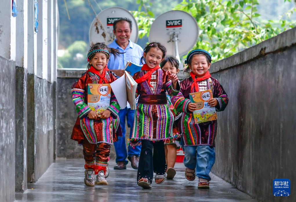 2024年9月6日,在贵州省黔东南苗族侗族自治州从江县西山镇的中寨教学点,教师孟荣达(后)与学生们在下课后走出教室。多年来,孟荣达坚守乡村教育一线,守望着孩子们走出大山的梦想。