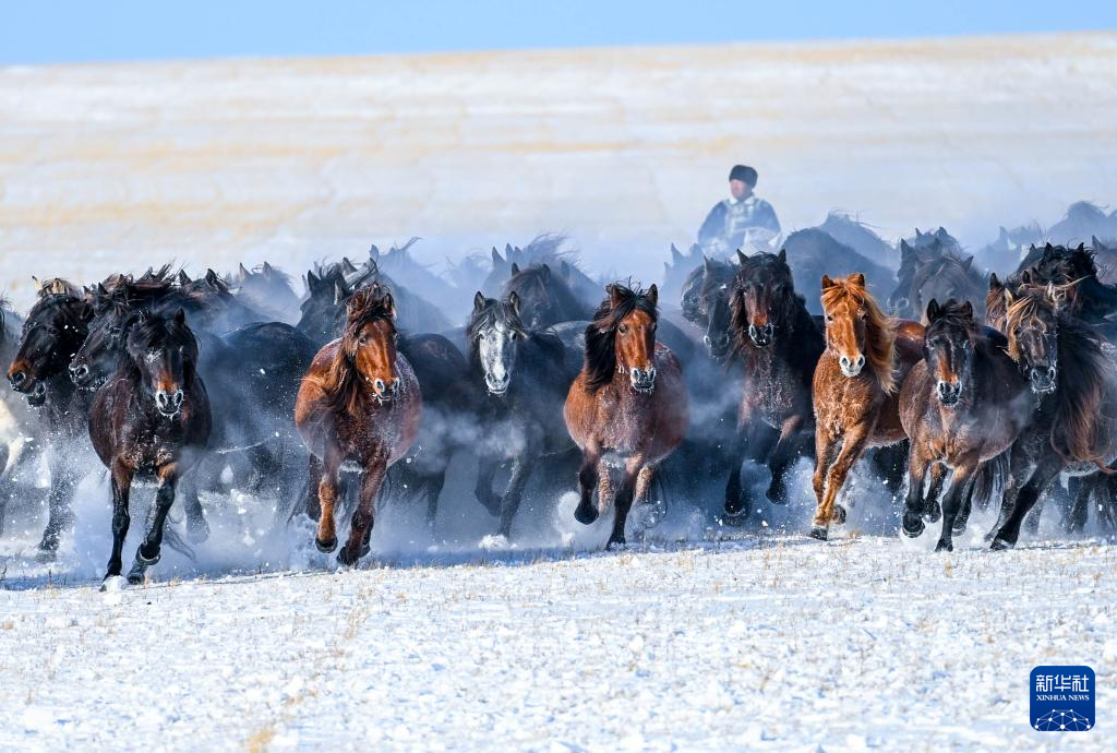 2024年12月12日,内蒙古锡林郭勒盟东乌珠穆沁旗的牧民在雪原上驯马。