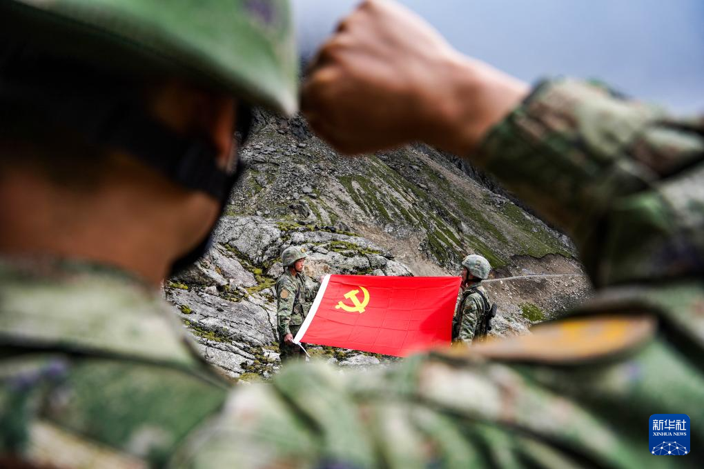 2024年6月29日,驻守在海拔4676米的西藏军区某边防团标沙拉错哨所的官兵开展向党旗宣誓活动,庆祝中国共产党成立103周年。