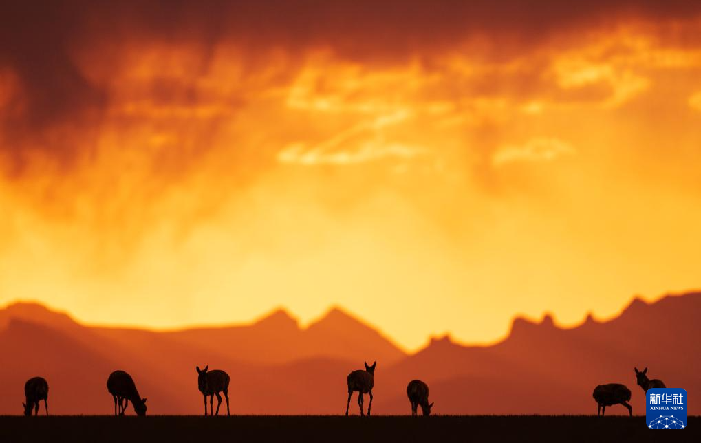 2024年6月16日,在羌塘国家级自然保护区境内的西藏那曲市申扎县买巴乡鲁确塘草原上,待产的藏羚羊沐浴在晚霞中。目前青藏高原上生活着30多万只藏羚羊,其中超过20万只生活在西藏北部的羌塘国家级自然保护区内。