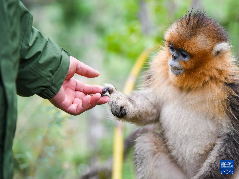 2024年10月11日,在四川白河国家级自然保护区,保护区服务中心太平保护站川金丝猴研究中心监测队队长唐玉林与川金丝猴互动。