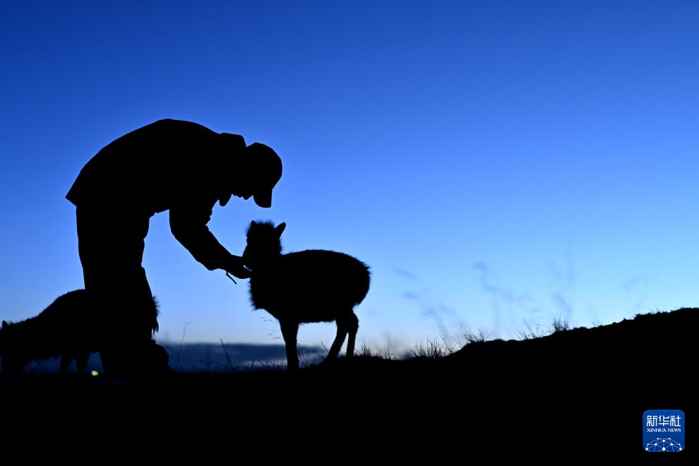 2024年1月18日,在青海省三江源国家公园管理局长江源园区可可西里管理处索南达杰保护站,巡山队员才文多杰与被救助的藏羚羊幼仔在一起。因救助藏羚羊幼仔而修建的保护站被称为“藏羚羊幼儿园”。