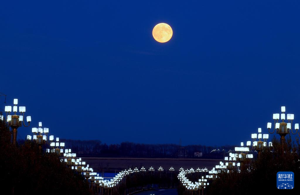 2024年10月17日在黑龙江省北安市延安大街拍摄的“超级月亮”。当日是2024年满月时刻与月球近地点时刻最接近的一次,这轮满月也就成为年度最大满月。