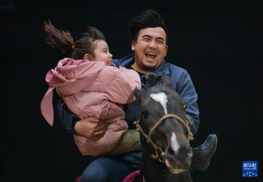 2024年3月7日,在位于乌鲁木齐市的新疆野马集团古生态园汗血马基地,驯马师希尔扎提·奴鲁木抱着女儿夏克拉一起骑马。