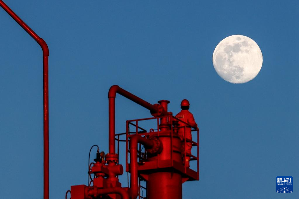 2024年1月24日,工人在位于渤海湾的埕北油田平台欣赏升起的月亮。埕北油田是中国海域第一个完全按照国际规范和标准建设的现代化油田,于1985年投产。