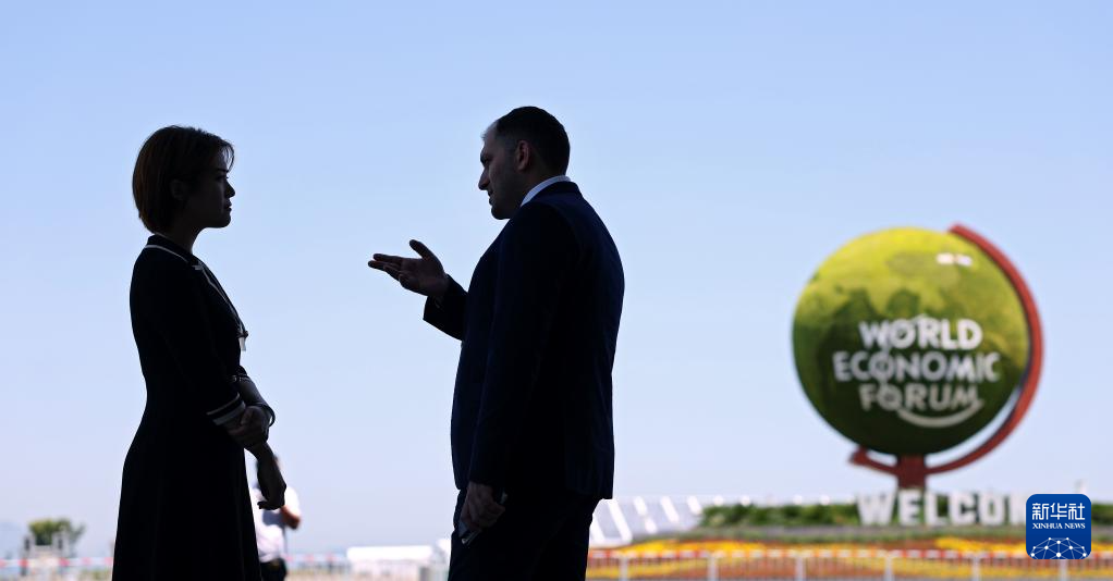 2024年6月26日,世界经济论坛第十五届新领军者年会举行期间,两位嘉宾在主会场大连国际会议中心外交流。