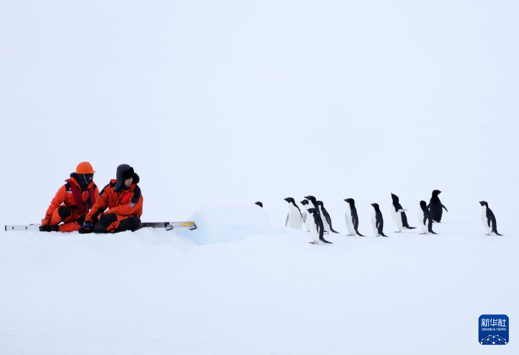 2024年12月8日,执行中国第41次南极考察任务的“雪龙”号和“雪龙2”号在南极中山站区域开展卸货作业。考察队员的工作吸引了企鹅前来“围观”。