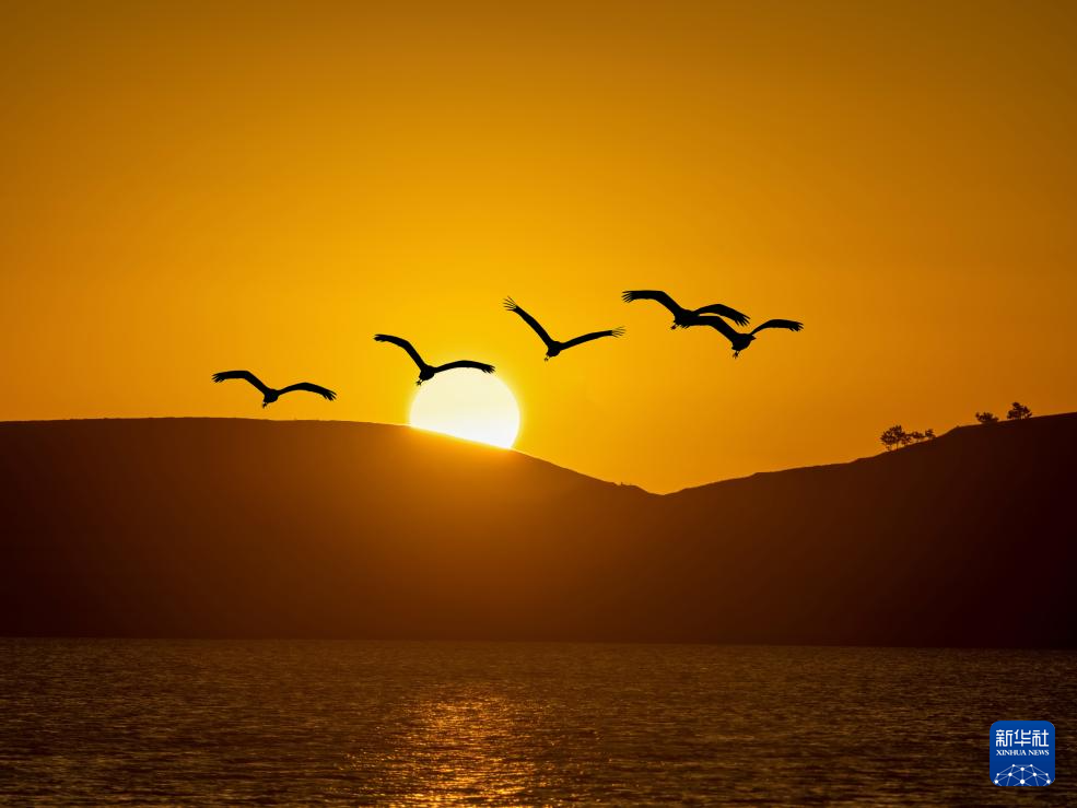2024年1月1日,在云南省昭通市大山包黑颈鹤国家级自然保护区,国家一级保护动物黑颈鹤迎着新年的第一缕晨光自由飞翔。