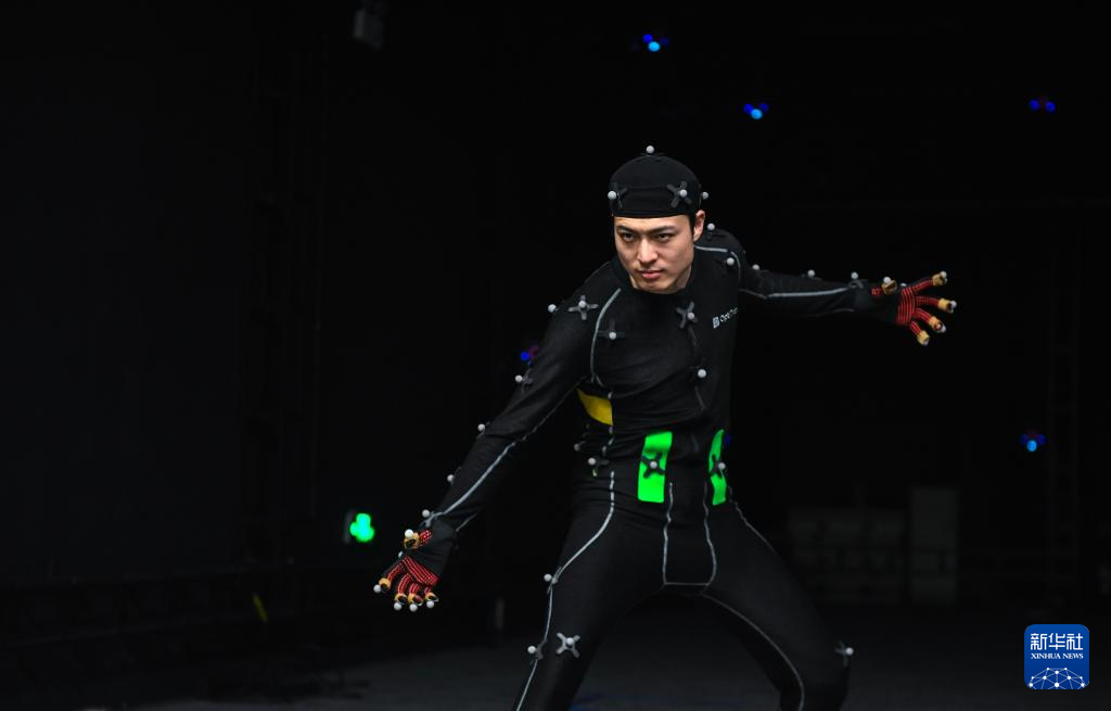 2024年8月28日,在广东深圳的一个动捕基地,动捕演员殷凯在演出中利用肢体动作展现游戏角色特点。殷凯是我国首款3A游戏《黑神话:悟空》主角的主要动捕演员。