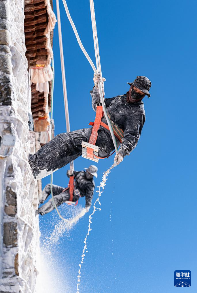2024年10月30日,工作人员在西藏拉萨布达拉宫外墙喷洒涂料。独特配方的涂料更具黏性而且不易脱落,从而更好地保护古建墙体。