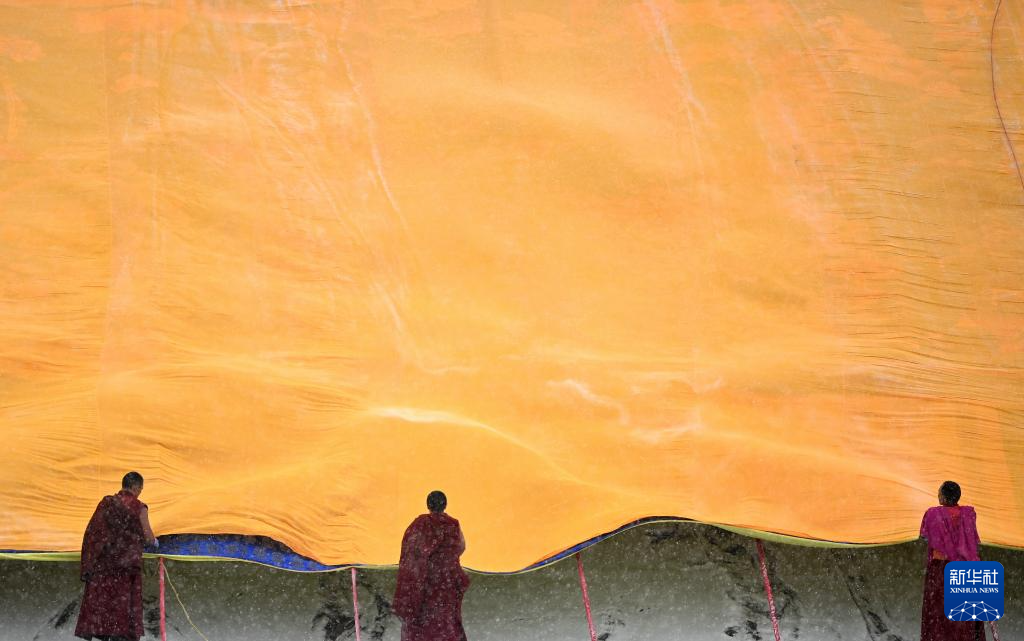 2024年2月22日,位于甘肃省甘南藏族自治州夏河县的拉卜楞寺举行盛大的瞻佛节,僧人展开覆盖黄色幔帐的佛像唐卡。