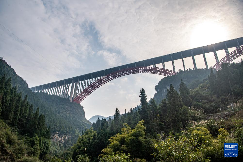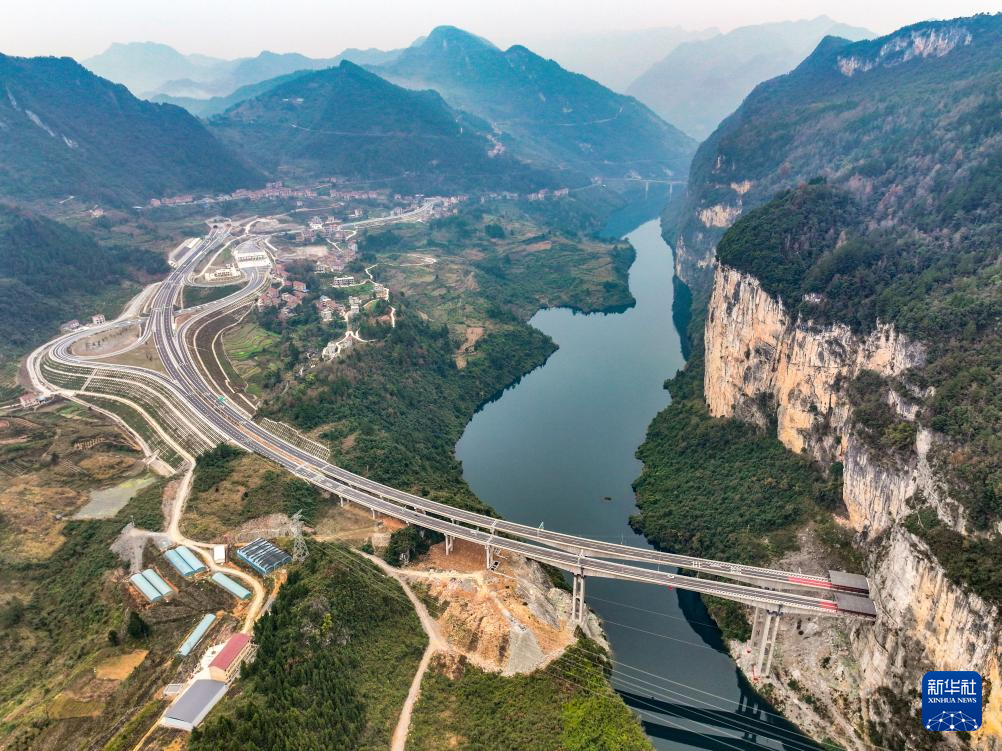 这是1月1日拍摄的渝湘复线高速公路磨寨乌江特大桥(无人机照片)。