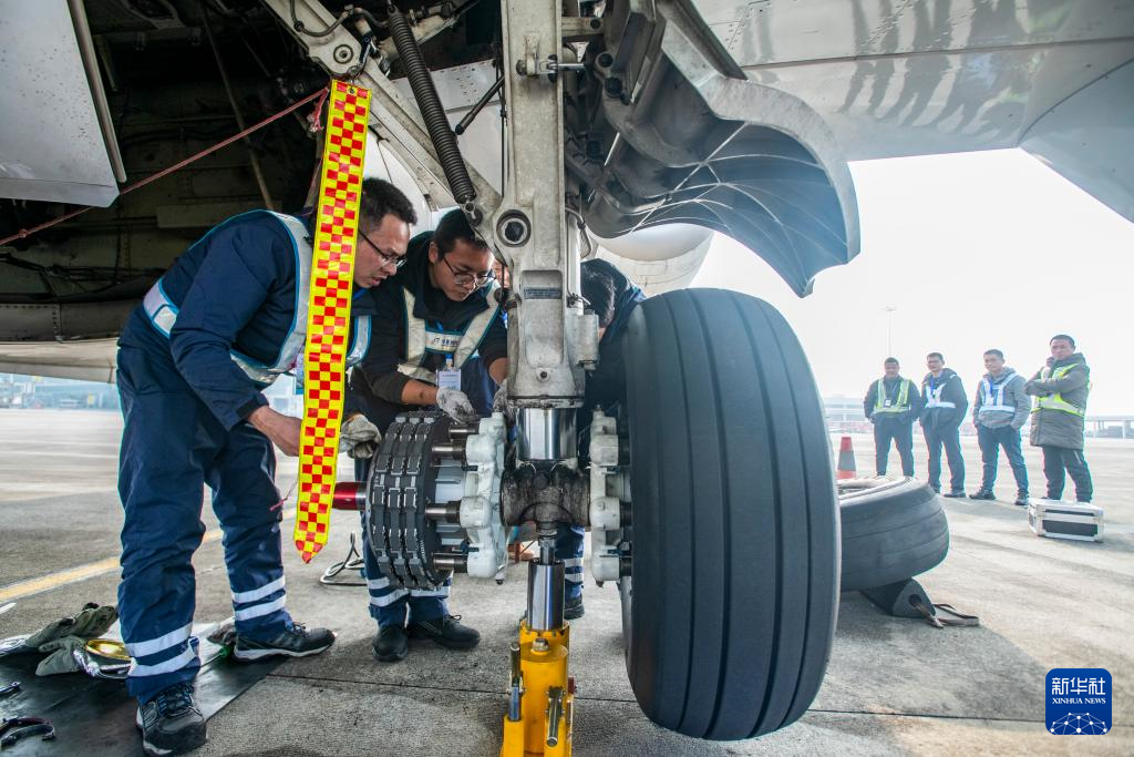 2024年12月31日,重庆万州五桥机场,技术人员为执行本次验证飞行测试的国产C909飞机安装国产制动系统零部件。