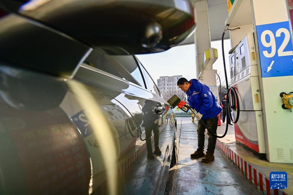 1月2日,河北石家庄新乐市一家加油站工作人员给车辆加油。