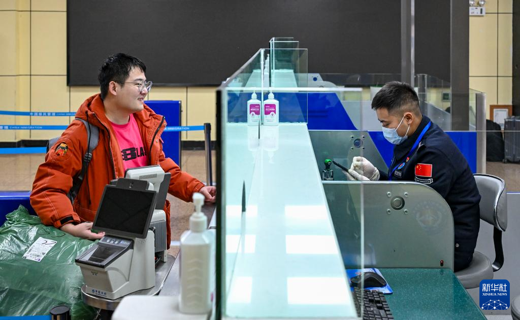 1月2日,在红其拉甫口岸联检大厅,红其拉甫出入境边防检查站民警查验一名拟前往巴基斯坦旅游游客的证件。
