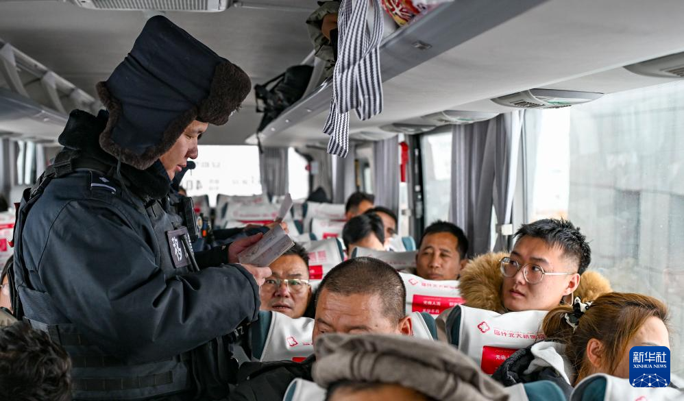 1月2日,在红其拉甫口岸,红其拉甫出入境边防检查站民警在一辆出境旅客大巴车上查验证件。