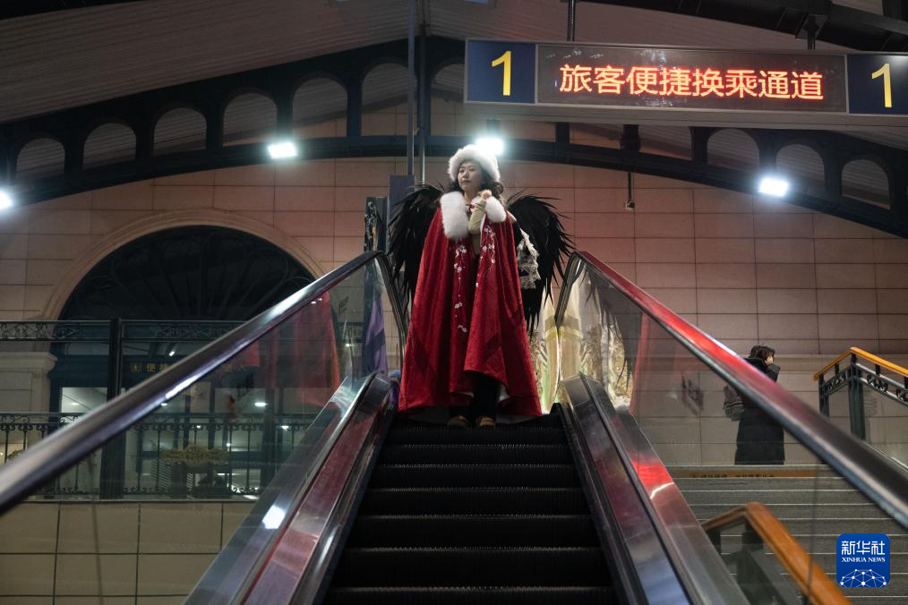 1月2日,在哈尔滨火车站,乘客换完服装准备拍摄。