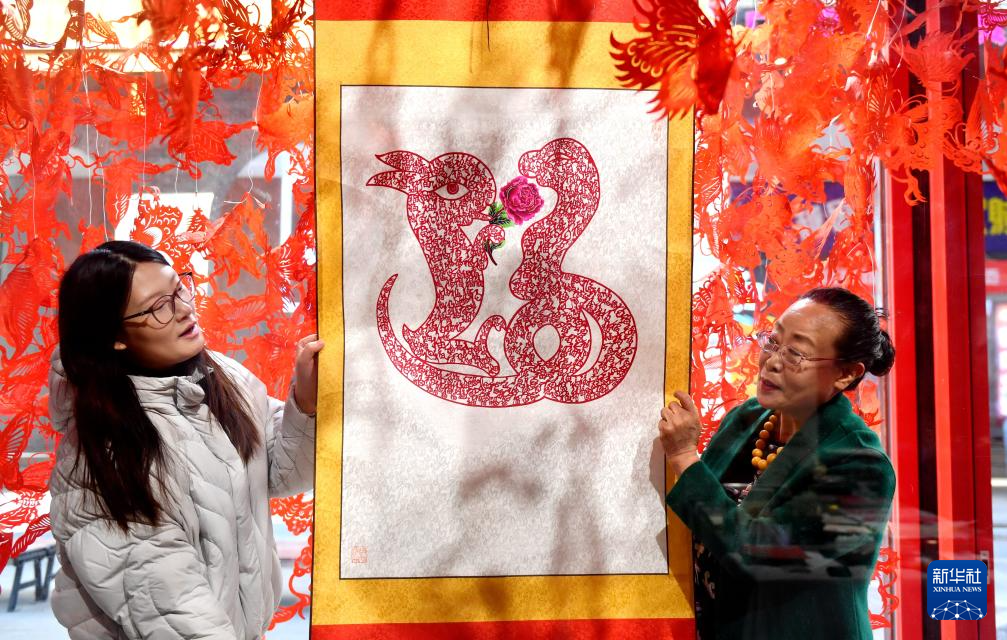 1月3日,蔚县剪纸国家级代表性传承人周淑英(右)在河北省石家庄市新华区名家工作室向剪纸爱好者介绍生肖蛇作品。
