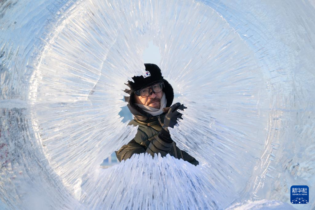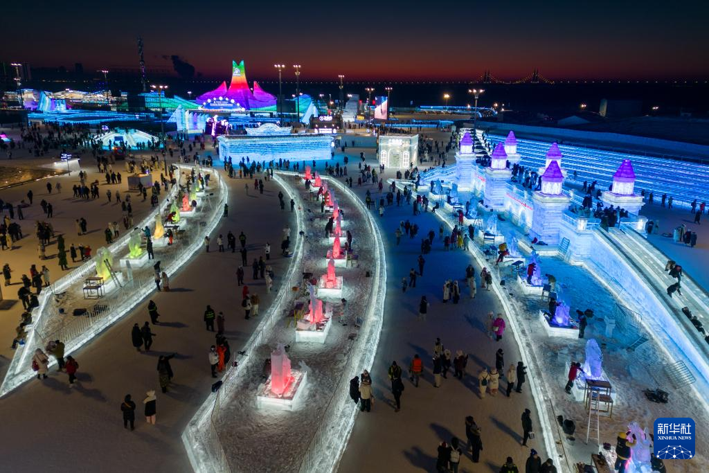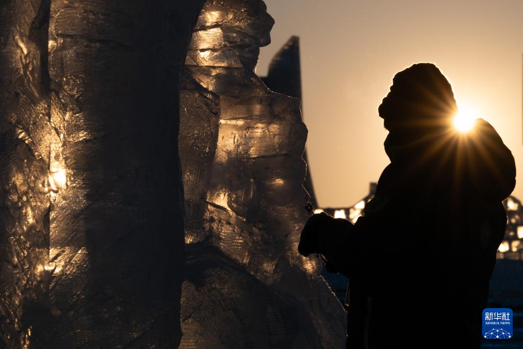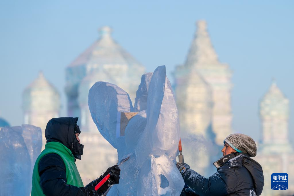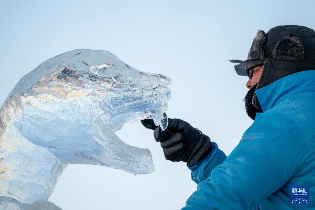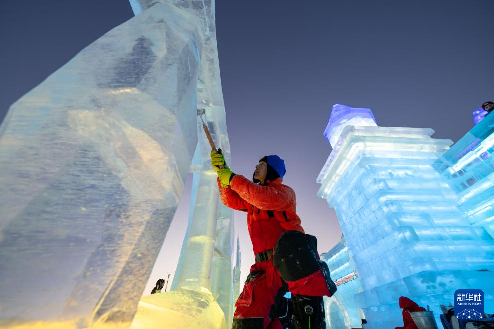 1月3日,参赛选手在冰雪大世界园区内进行冰雕创作。
