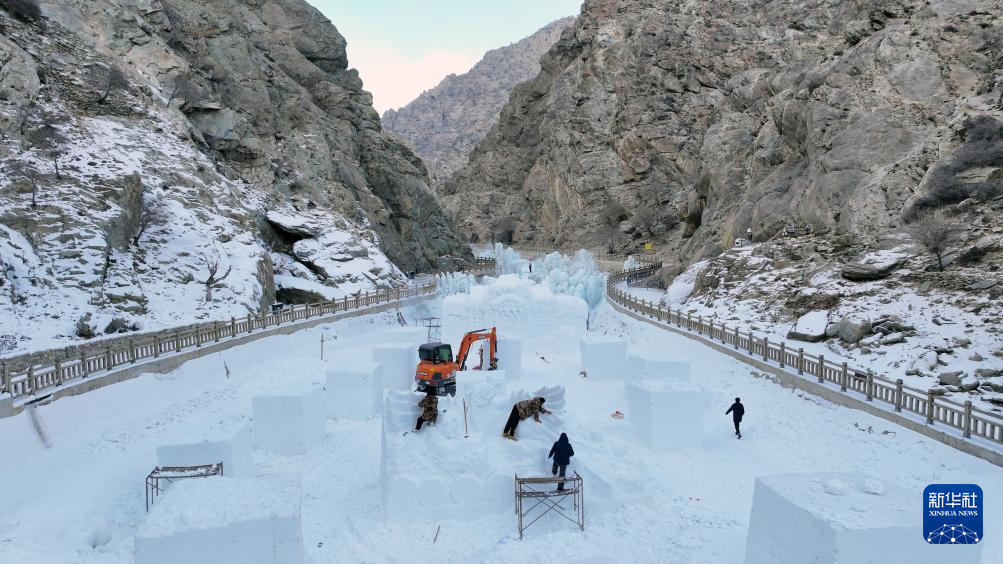 1月4日,工作人员在贺兰山岩画景区制作雪雕(无人机照片)。