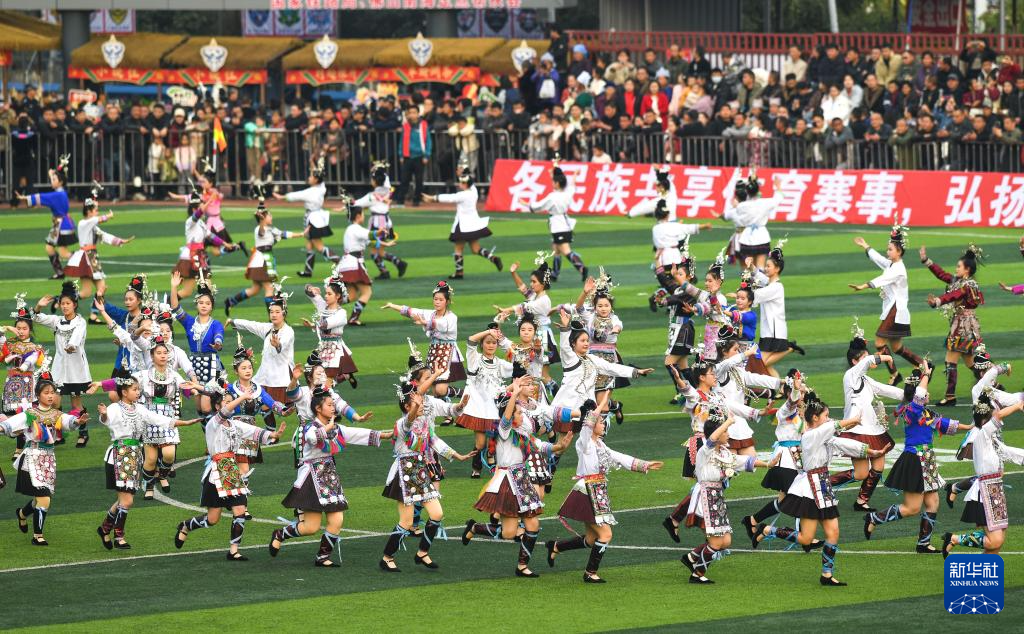 1月4日,榕江三中的学生在揭幕战半场时间表演舞蹈《侗家姑娘》(无人机照片)。