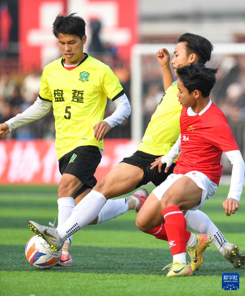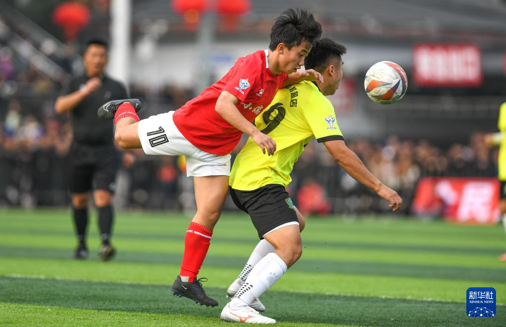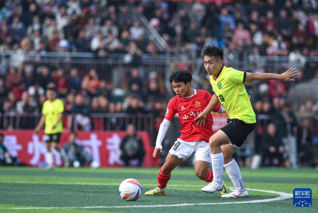 1月4日,小瑞村足球队球员石龙(左)与盘踅村足球队球员在揭幕战比赛中。