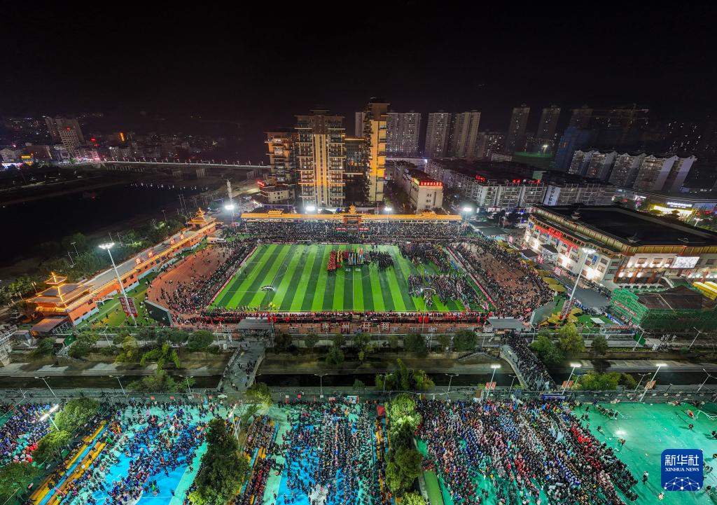 1月4日,人们在“村超村晚”活动中表演非遗节目“多耶”(无人机照片)。