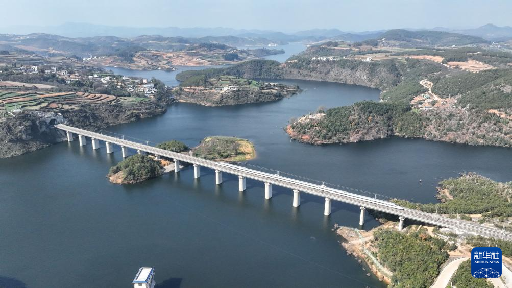 1月4日,动车组列车驶过云南省曲靖市马龙区旧县镇车马碧水库(无人机照片)。