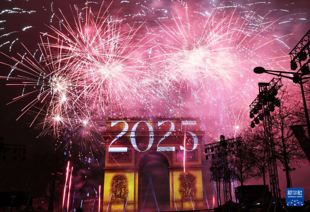 这是2025年1月1日在法国巴黎凯旋门拍摄的新年焰火。